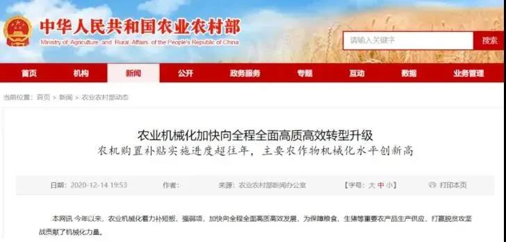 ? ? 農(nóng)業(yè)農(nóng)村部網(wǎng)站近日消息,今年以來,農(nóng)業(yè)機械化著力補短板、強弱項,加快向全程全面高質(zhì)高效發(fā)展,為保障糧食、生豬等重要農(nóng)產(chǎn)品生產(chǎn)供應(yīng),打贏脫貧攻堅戰(zhàn)貢獻了機械化力量。