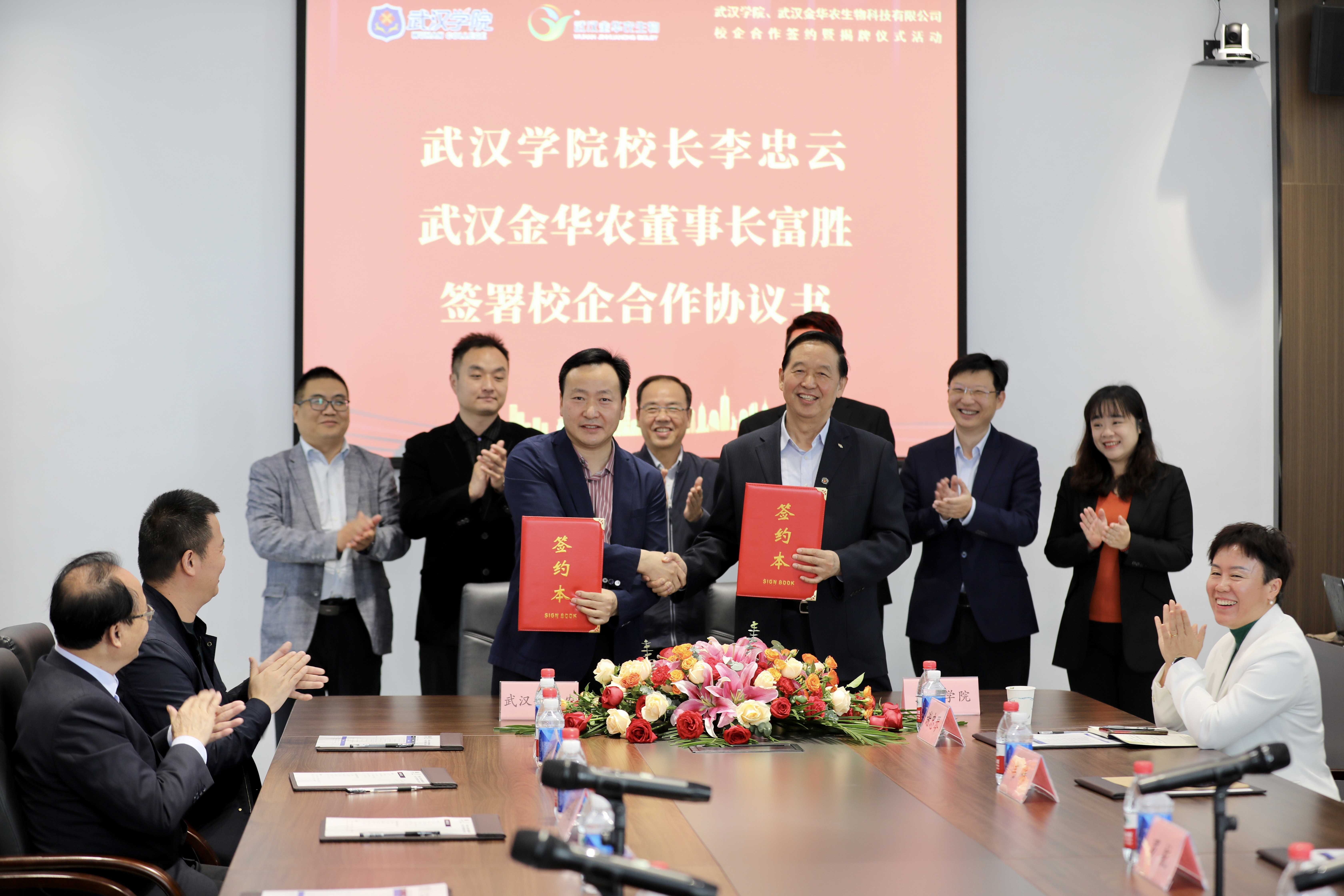 武漢學(xué)院校長李忠云、副校長羅航、管理學(xué)院院長李延暉、教務(wù)處處長韋瑋、金融與經(jīng)濟學(xué)院副院長周利、教務(wù)處副處長謝忠琴、學(xué)生工作處副處長戚蘭,武漢金華農(nóng)生物公司董事長富勝、副總經(jīng)理黃凡、市場總監(jiān)郭昌盛、人事總監(jiān)梅寒、技術(shù)總監(jiān)吳志良、湖北分公司總經(jīng)理劉總、山東分公司總經(jīng)理徐總及公司相關(guān)代表出席簽約儀式。會議特邀原湖北省總工會黨組書記、常務(wù)副主席馬建中參加見證簽約揭牌儀式。