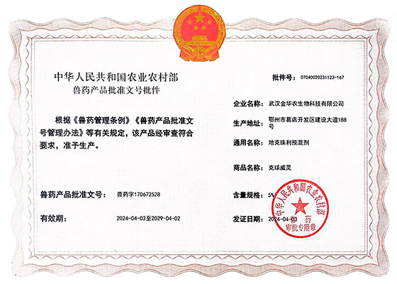 根據(jù)《獸藥管理?xiàng)l例》和《獸藥產(chǎn)品批準(zhǔn)文號管理辦法》的規(guī)定,經(jīng)農(nóng)業(yè)農(nóng)村部審查,準(zhǔn)予核發(fā)武漢金華農(nóng)生物科技有限公司2個(gè)新版GMP獸藥相關(guān)產(chǎn)品批準(zhǔn)文號。