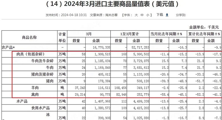 4月18日,海關(guān)總署發(fā)布最新數(shù)據(jù),2024年3月中國(guó)進(jìn)口肉類(包含雜碎)58萬(wàn)噸,同比下降11.4%;總進(jìn)口金額為142.1億人民幣,同比下降11.6%。